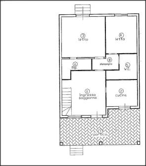 Soggiorno, una camera da letto, cucina abitabile, disimpegno, ripostiglio, bagno, ampio portico collegato direttamente alla zona giorno, locale caldaia e serbatoio idrico.